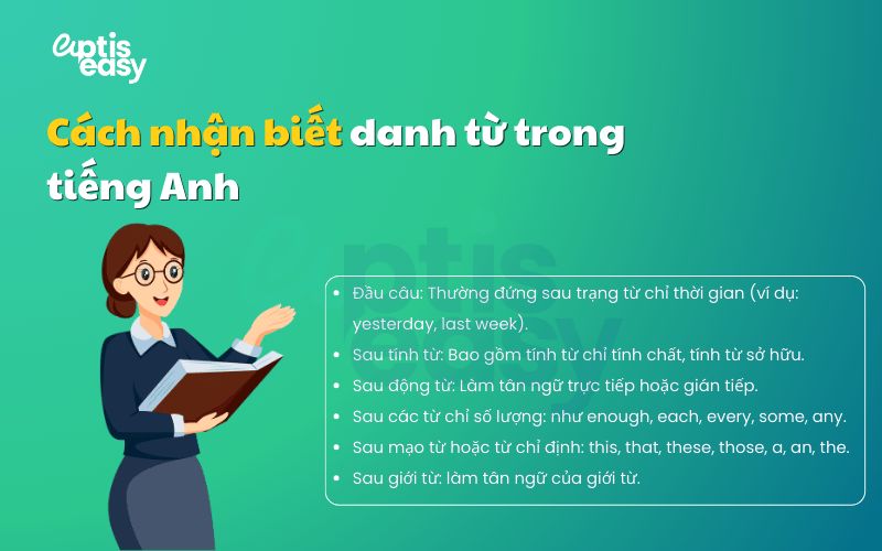 Phân biệt danh từ trong tiếng AnhDanh từ là một trong những từ loại cơ bản và quan trọng nhất trong Tiếng Anh. Chúng ta sử dụng danh từ để chỉ người, vật, địa điểm, ý tưởng hay khái niệm. Để phân biệt danh từ một cách chính xác, chúng ta cần hiểu rõ về vị trí của danh từ trong câu và các dấu hiệu đặc trưng của chúng.