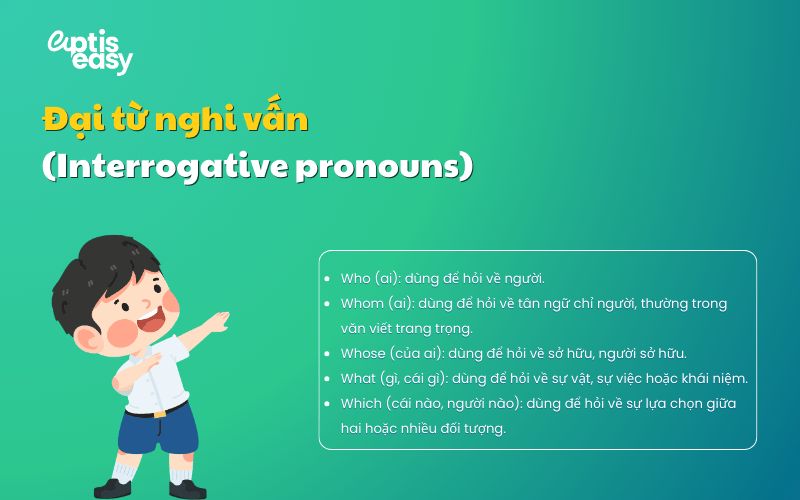 Đại từ nghi vấn (interrogative pronouns) là các từ dùng để hỏi về người, vật, số lượng, cách thức, thời gian, địa điểm, lý do trong câu.