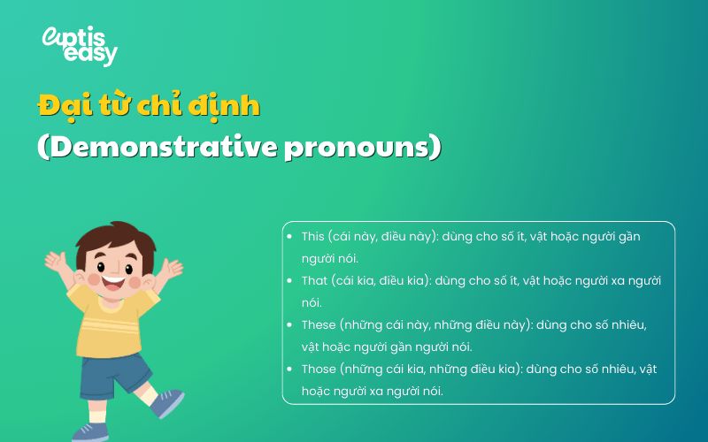 Trong tiếng Anh, có bốn đại từ chỉ định chính, được phân loại dựa trên số ít, số nhiều và khoảng cách từ người nói: