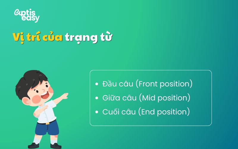 Trạng từ chỉ cách thức, trạng từ thời gian, trạng từ nơi chốn. |