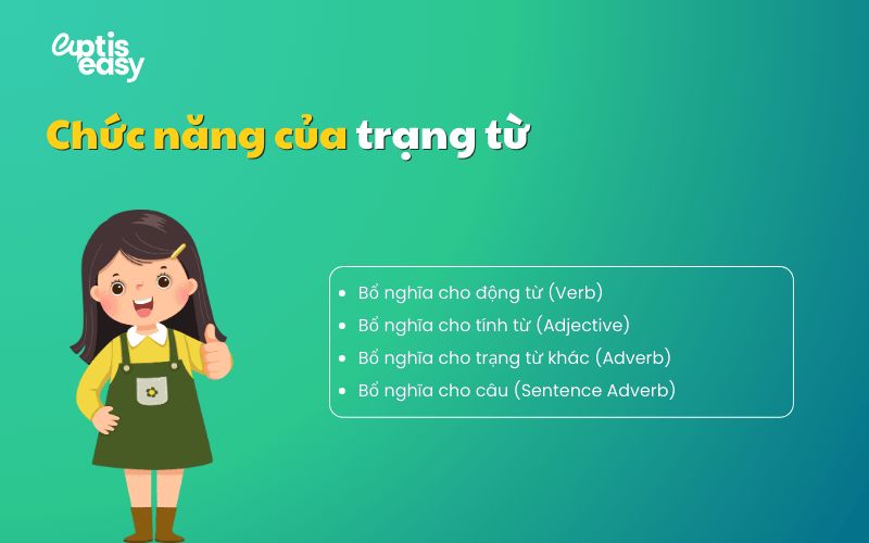 Bổ nghĩa cho động từ (Verb): Diễn tả cách thức, thời gian, tần suất, mức độ, quan hệ của hành động.